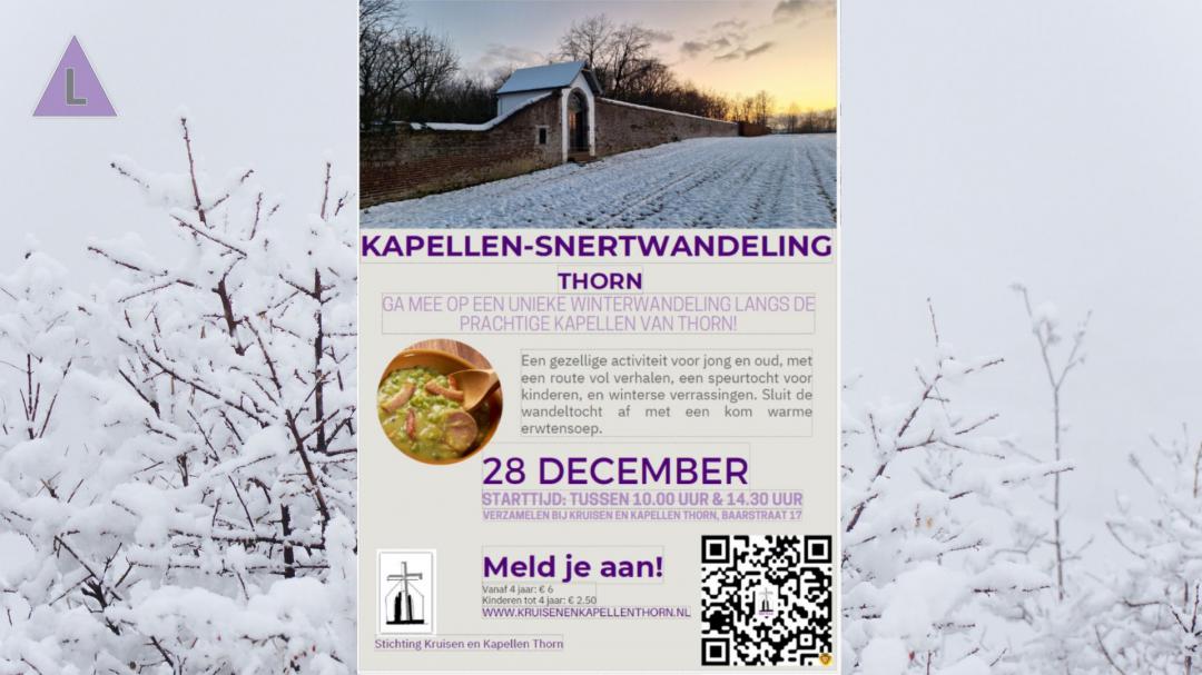 Thorn - 21 december 2025 - Ga op zondag 28 december mee op een unieke winterwandeling langs de mooie kapellen in en rond Thorn. Een gezellige activiteit voor jong en oud met een route vol verhalen, opdrachten en winterse verrassingen. Voor de kinderen is er een speurtocht. Sluit de 6,5 km lange wandeling af met een gratis kop vers gemaakte warme erwtensoep.