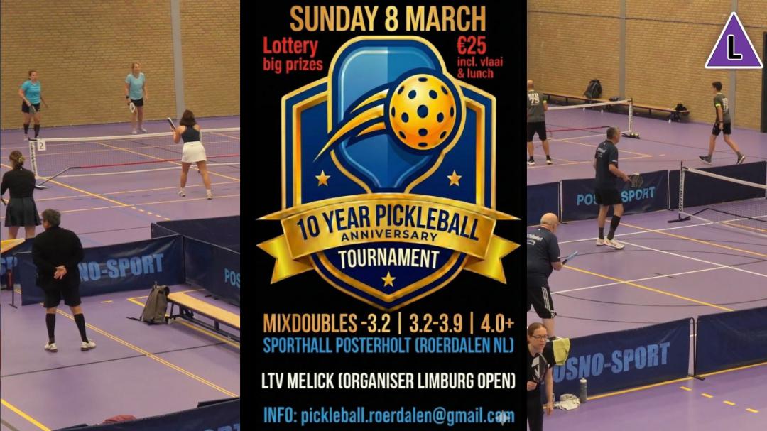 Posterholt - 4 maart 2026 - Op zondag 8 maart wordt met een speciaal jubileumtoernooi in Posterholt gevierd dat in Roerdalen al 10 jaar de sport pickleball wordt gespeeld. Dertig teams (heer&dame) op drie speelniveaus (beginner, intermediate en advance) nemen het tegen elkaar op. Naast Nederlandse spelers zijn er ook deelnemers afkomstig uit België en Duitsland. Iedereen is van harte uitgenodigd dit bijzondere toernooi te bezoeken en de wedstrijden te bekijken.